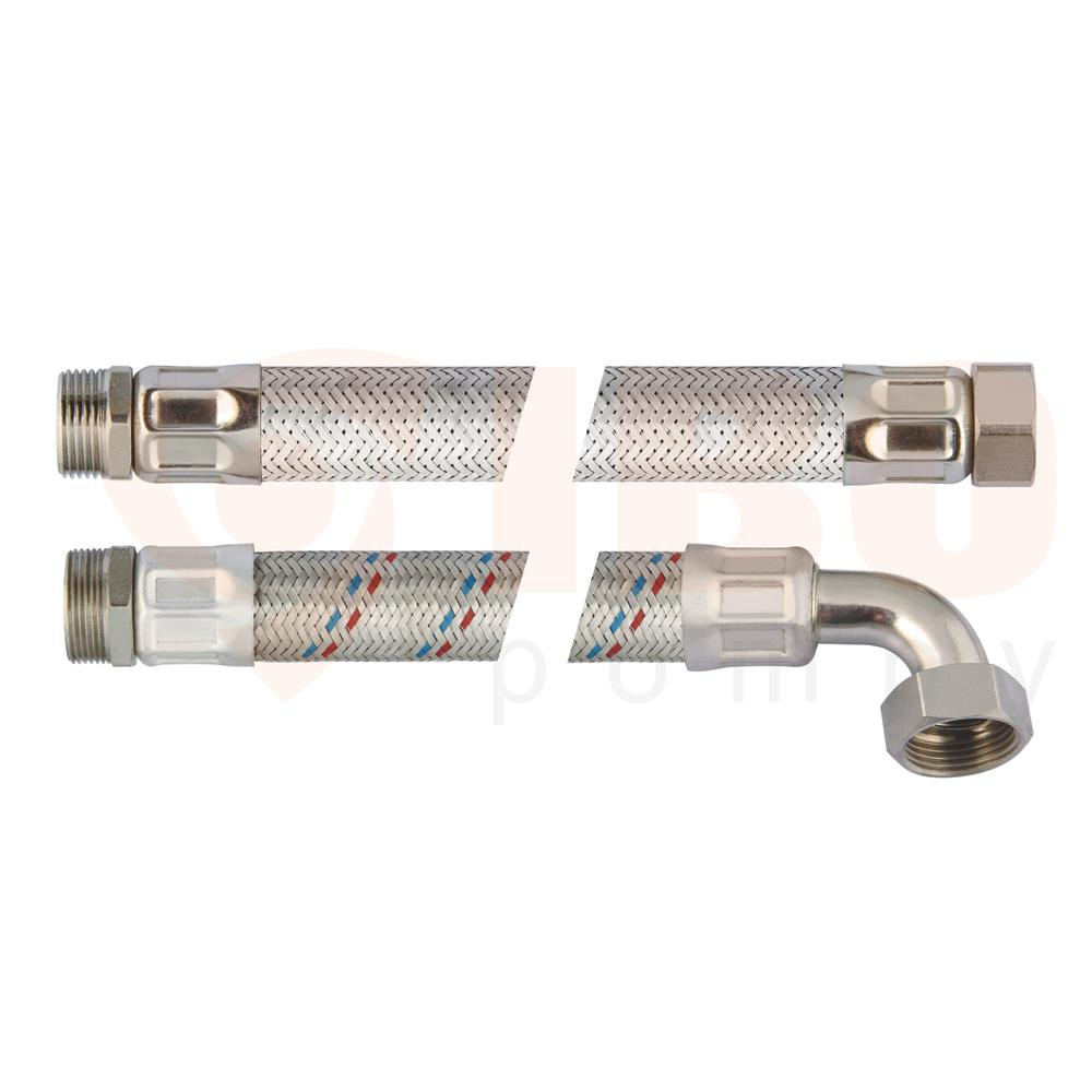 Elastyczny wąż antywibracyjny kolanowy wykonany z gumy syntetycznej EPDM, która dopuszczona jest do kontaktu z wodą pitną. Wąż posiada metalowy oplot zabezpieczający przewód tłoczny. Z jednej strony wąż zakończony jest kolanem z obrotowym śrubunkiem z uszczelką, z drugiej strony nyplem, obie końcówki wykonane zostały z mosiądzu. Produkt sprawdzi się w dystrybucji wody w instalacjach grzewczych i klimatyzacyjnych, domowych instalacjach wodnych oraz przy wszystkich giętkich połączeniach pomp i zbiorników hydroforowych.