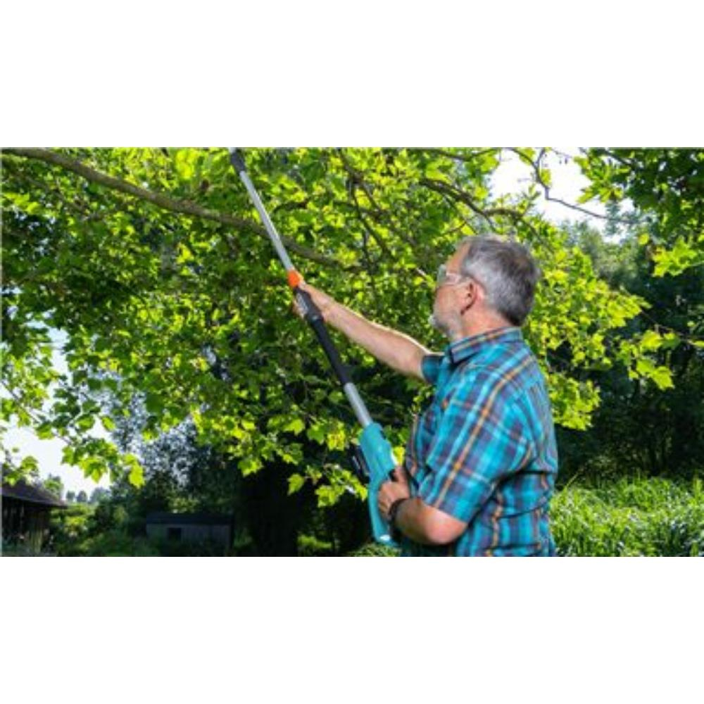 Pilarka akumulatorowa z trzonkiem teleskopowym TCS 20/18V P4A marki GARDENA. Jest specjalnie skonstruowana do bezpiecznego usuwania gałęzi z górnych partii drzew – bez użycia drabiny. Trzonek teleskopowy umożliwia usuwanie niemal niedostępnych gałęzi. Umożliwia wygodnie, bez wysiłku i dużego nakładu siły, w bezpieczny sposób usuwać wysoko położone gałęzie, bez wspinania się na drzewo. Łatwe ustawianie długości trzonka, przy czym możliwy jest zasięg do 4 m.
