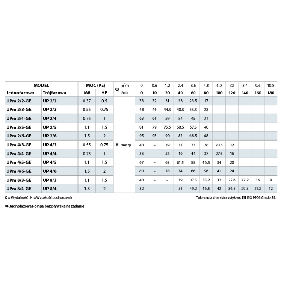 również w wersji jednofazowej 230 V- 50 Hz z wyłącznikiem pływakowym (UP