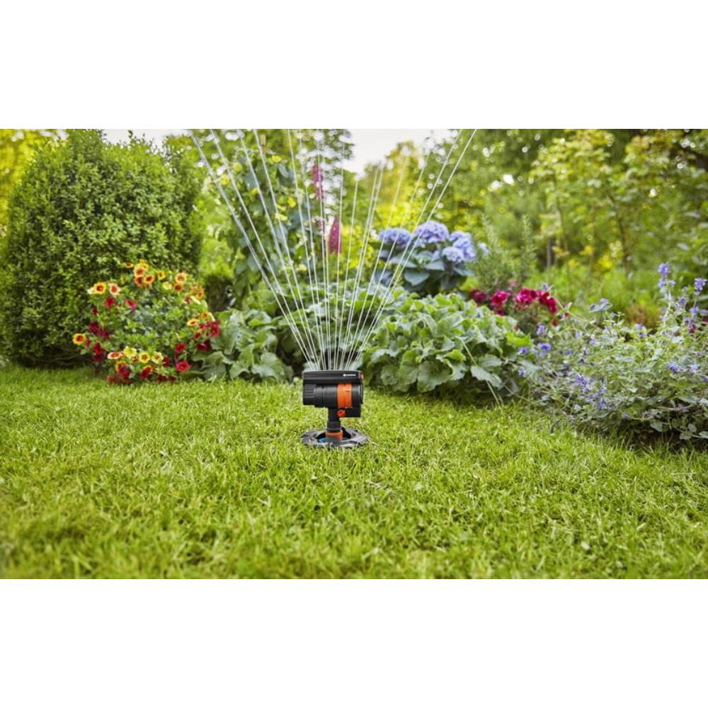 Zraszacz wahadłowy z systemu Pipeline marki Gardena. Nawadnia równomiernie, precyzyjnie bez tworzenia kałuż na obszarze o powierzchni od 9 do 216 m2. Wystarczy jednym kliknięciem podłączyć zraszacz do puszki poboru wody i można już zacząć podlewać trawnik, rośliny czy grządki warzywne. Zasięg nawadniania to 3-18 metrów, szerokość zraszania to natomiast 3-12 metrów, regulowane za pomocą pokręteł. Głowicę można też obracać ręcznie o 360°.