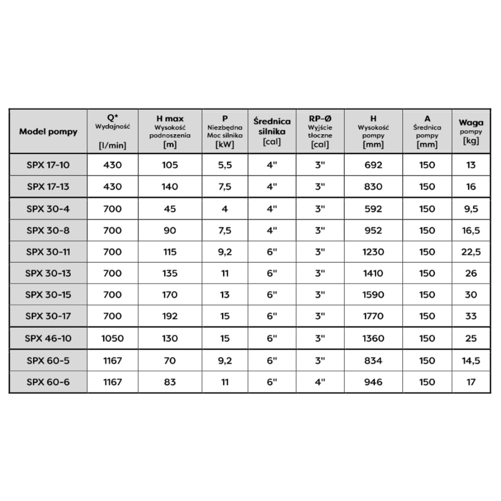 pomp 6’’ SPX, które różnią się wydajnością, wysokością podnoszenia oraz