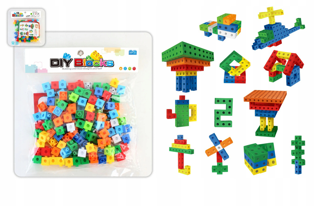 Opakowanie zawierz 122 szt. kolorowych klocków sześcianów.