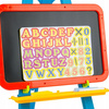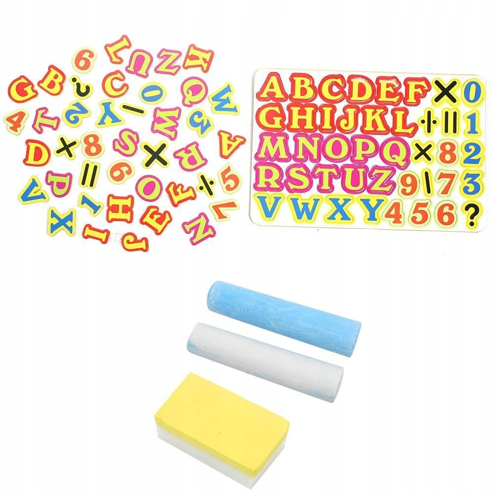 Zestaw posiada: 84 elementy (literki alfabetu, cyferki, symbole matematyczne) gąbka do zmazywania podkładka na gąbkę i literki 2 szt. kredy uchwyty na kartkę papieru, żeby móc na niej rysować