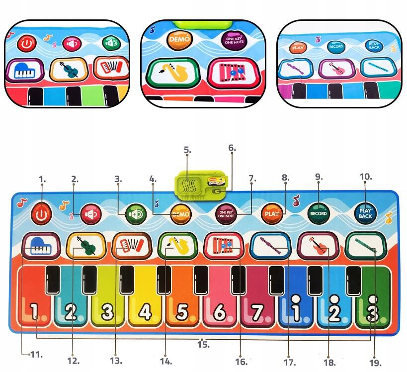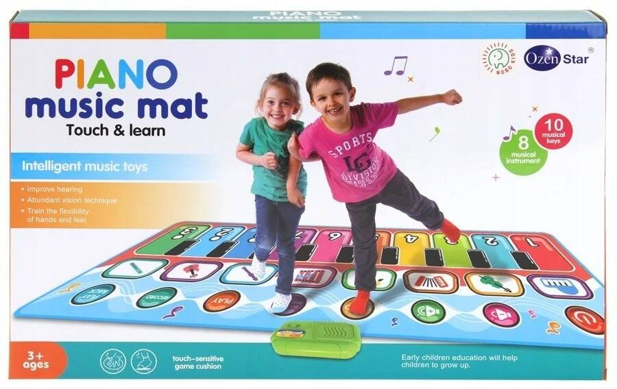 Interaktywna mata to fantastyczny pomysł na prezent, aby zagłębić dziecko w świat muzyki. Posiada ona duże wymiary, dzięki czemu można po niej bez problemu biegać, chodzić i tańczyć. Klawisze mogą wygrać dźwięki jak jeden z 8 instrumentów, których obrazki są przedstawione nad klawiaturą. Do wyboru mamy pianino, skrzypce, kontrabas, saksofon, cymbałki, klarnet, gitarę oraz flet. Pianino rozwinie koordynację ruchową u dziecka oraz doskonale wpłynie na naukę rozróżniania instrumentów.