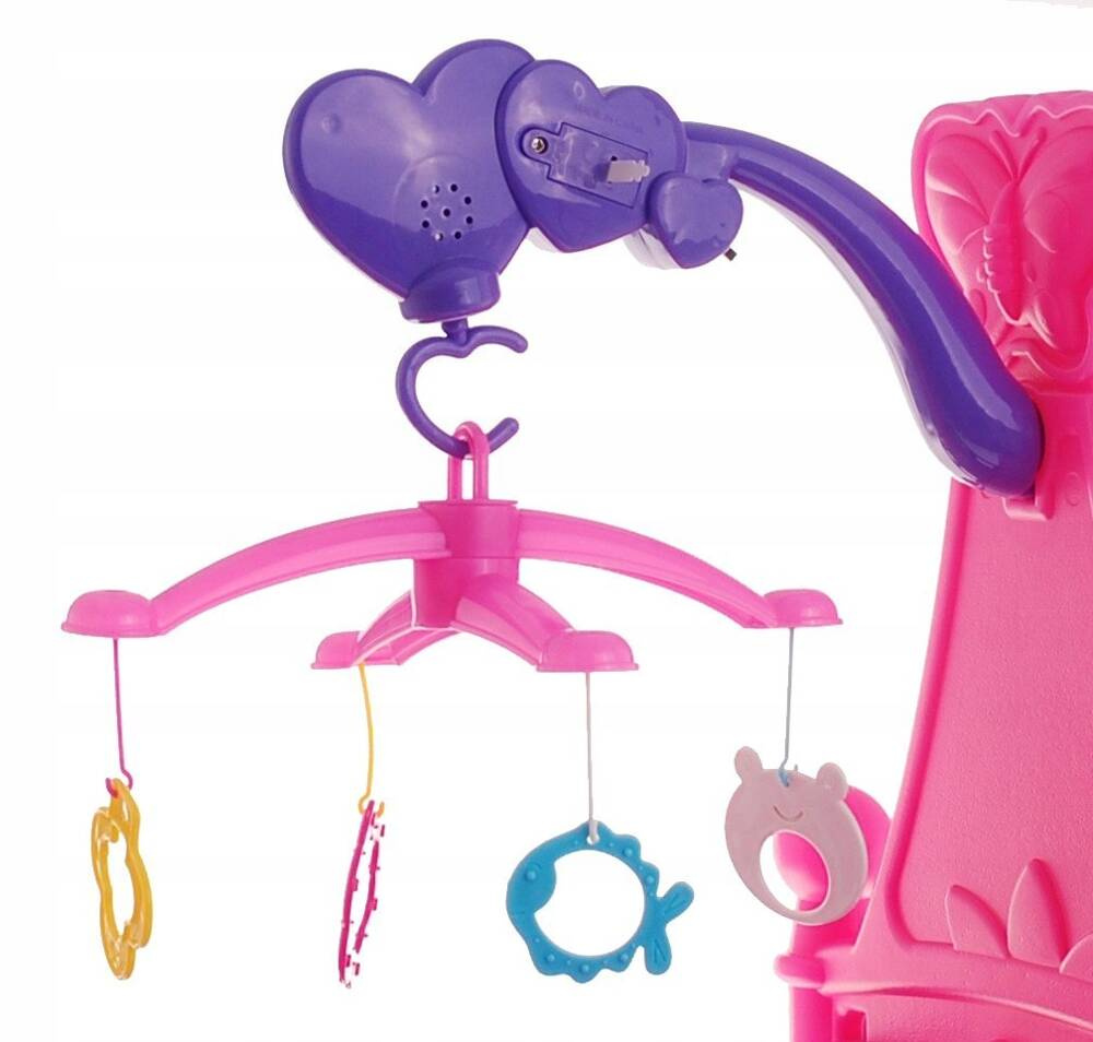 Wzornictwo zabawkowego łóżeczka aż do złudzenia przypomina pełnowymiarowe łózko dla malucha. Różowo-fioletowe elementy posiadają przepiękne dodatki, takie jak żłobione ornamenty czy serduszka na barierkach. Połączenie konstrukcji z obrotową karuzelą było świetnym pomysłem! Od teraz każda lala zaśnie w mgnieniu oka.