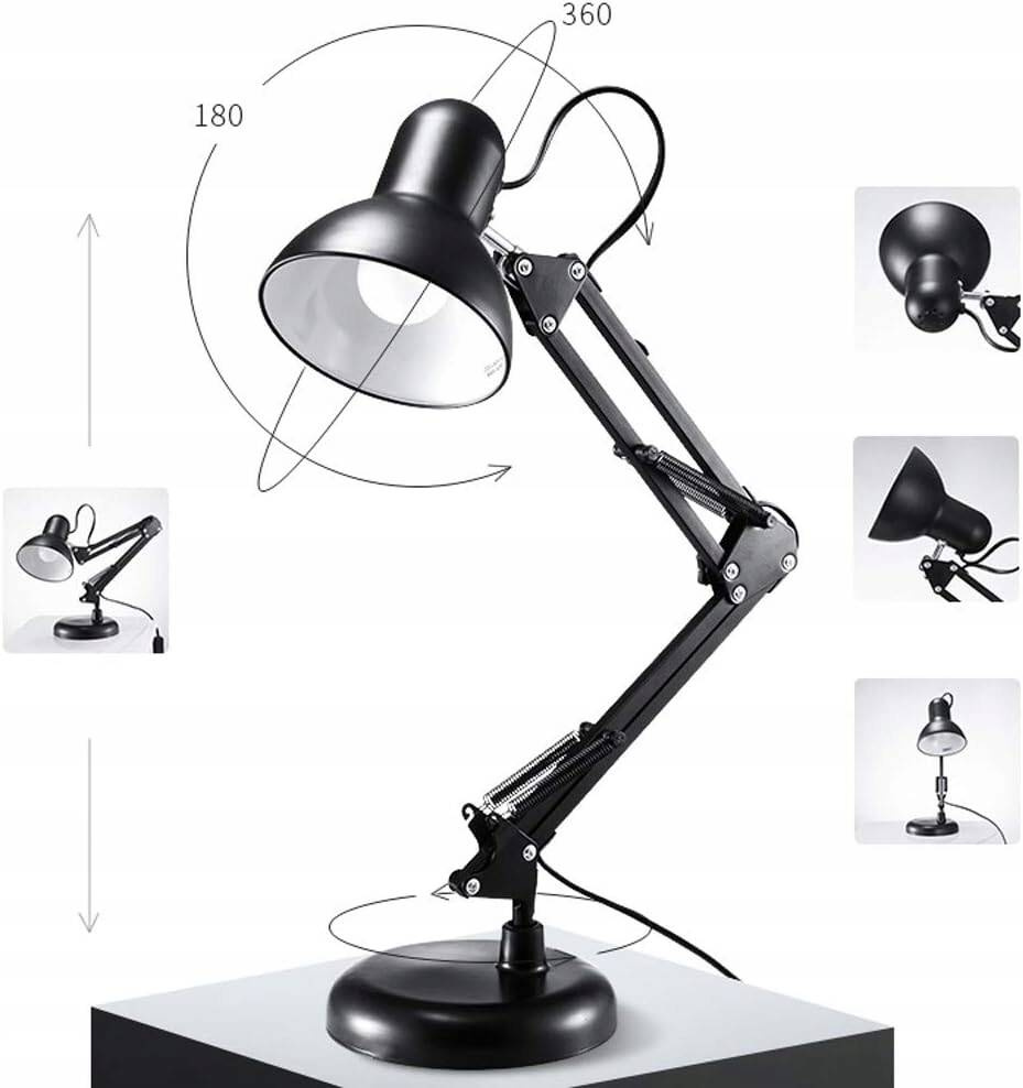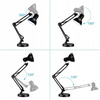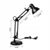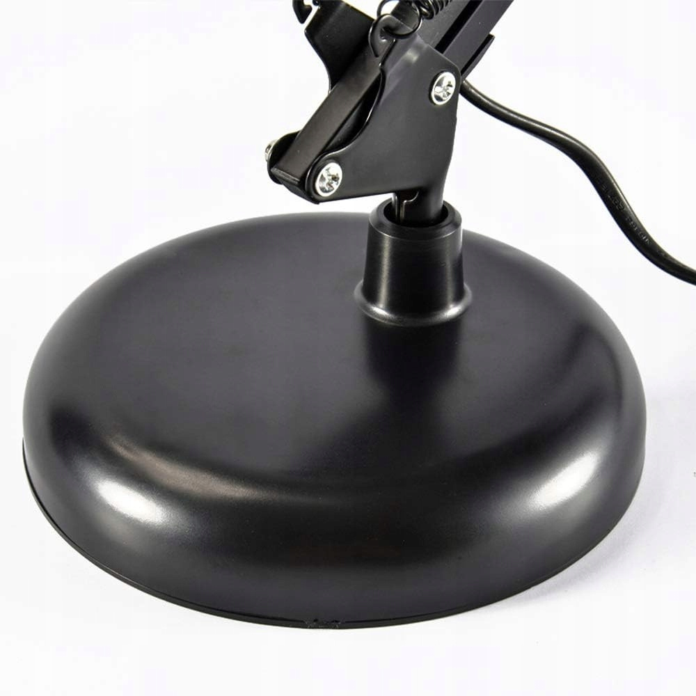 Nowoczesna czarna lampka kreślarska łączy elegancję z funkcjonalnością. Dzięki uchwytowi można ją zamocować na krawędzi blatu o różnej grubości, a w zestawie znajduje się również klasyczna podstawa, która pozwala postawić lampkę w dowolnym miejscu.