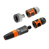 GARDENA zestaw podstawowy zawiera: przyłącze kranowe i adapter (art. nr 18202 i 5305), szybkozłącze (art. nr 18216), szybkozłącze ze stopem (art. nr 18214) oraz zraszacz prosty (art. nr 18300).