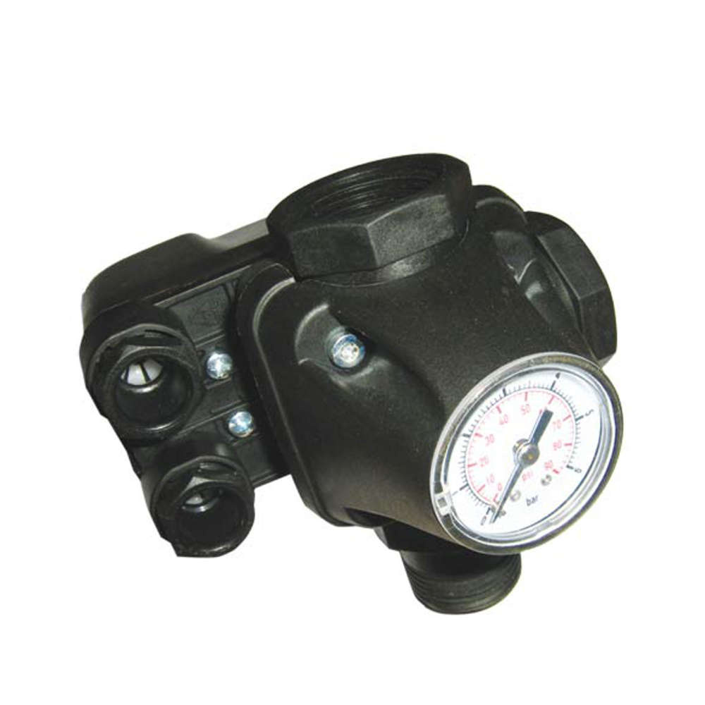 Zintegrowany osprzęt współpracuje z przyłączami z gwintem zewnętrznym i wewnętrznym o średnicy 1 cala. Automatyczny włącznik ciśnieniowy pracuje w warunkach ciśnienia od 1,7 do 2,5 bar, czyli uruchamia pompę, kiedy ustawimy dowolny parametr ciśnienia w tym dostępnym zakresie. Maksymalne ciśnienie wyłączania pompy to z kolei 3,5 bar. Regulacja odbywa się za pomocą śrub regulacyjnych. Manometr obsługuje zakres 0-10 bar.