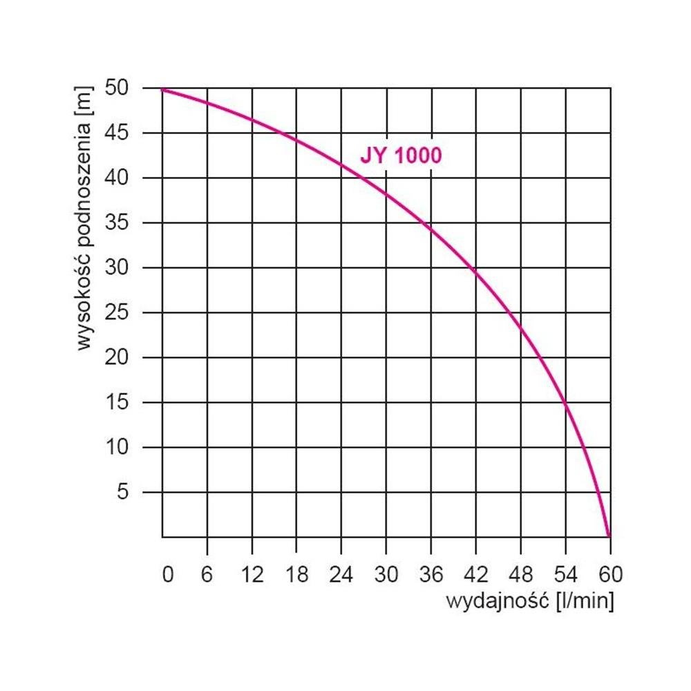 Maksymalna wydajność JY 1000 wynosi 60 l/min., maksymalna wysokość podnoszenia 50 m, maksymalne