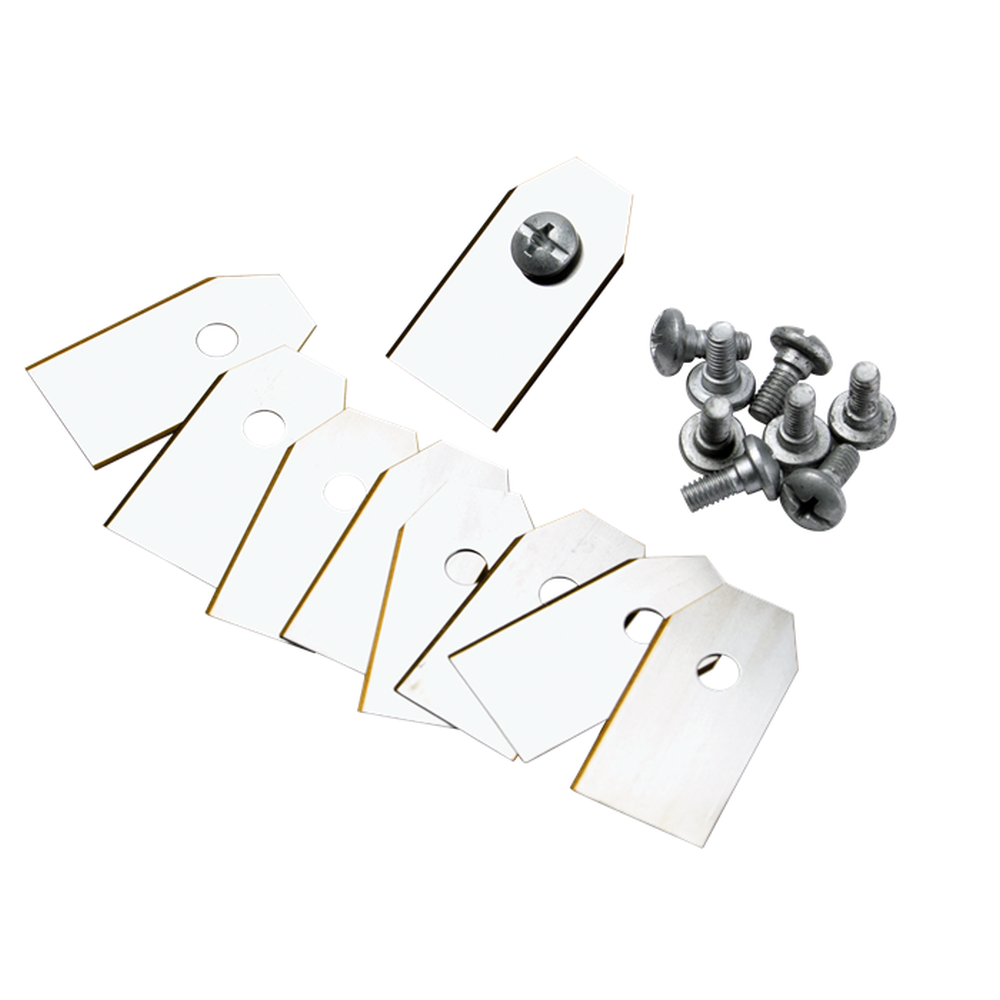 Zestaw 9 sztuk noży zapasowych i śrub przeznaczonych do robotów koszących Gardena modeli R40Li oraz R70Li. Noże mają długość 17 cm.