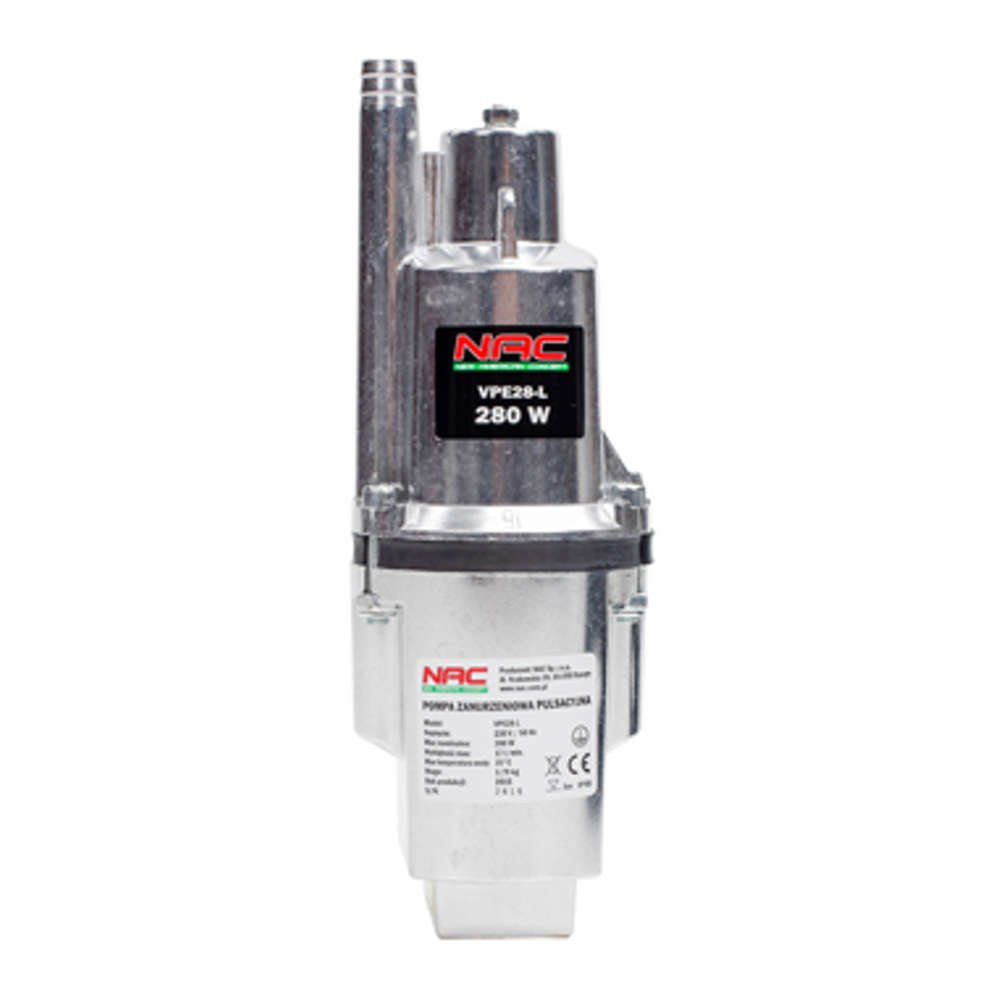 Pompa VPE28-L renomowanej firmy NAC to pompa głębinowa membranowa, pulsacyjna. Doskonale nadaje się do pompowania wody ze zbiorników znajdujących się dużo poniżej powierzchni ziemi. Jej mechanizm pulsacyjny zapewnia bardzo wysoką wydajność oraz sprawia, że pompa świetnie sprawdza się podczas wydobywania wody z różnego rodzaju zbiorników, fontann czy studni. W urządzeniu znajduje się silnik elektryczny, który jest w stanie wygenerować moc o wartości 280 W. Dzięki temu pompa jest w stanie podnieść słup wody nawet na wysokość 68 metrów. Jeżeli jest użytkowana bez przerwy przez godzinę, daje to możliwość przepompowania około 1020 litrów wody. Dużą zaletą pompy są jej niewielkie rozmiary – dzięki nim i dzięki faktowi, że urządzenie waży tylko niecałe 4 kg, jesteśmy w stanie bez problemu przenieść ją z miejsca na miejsce.