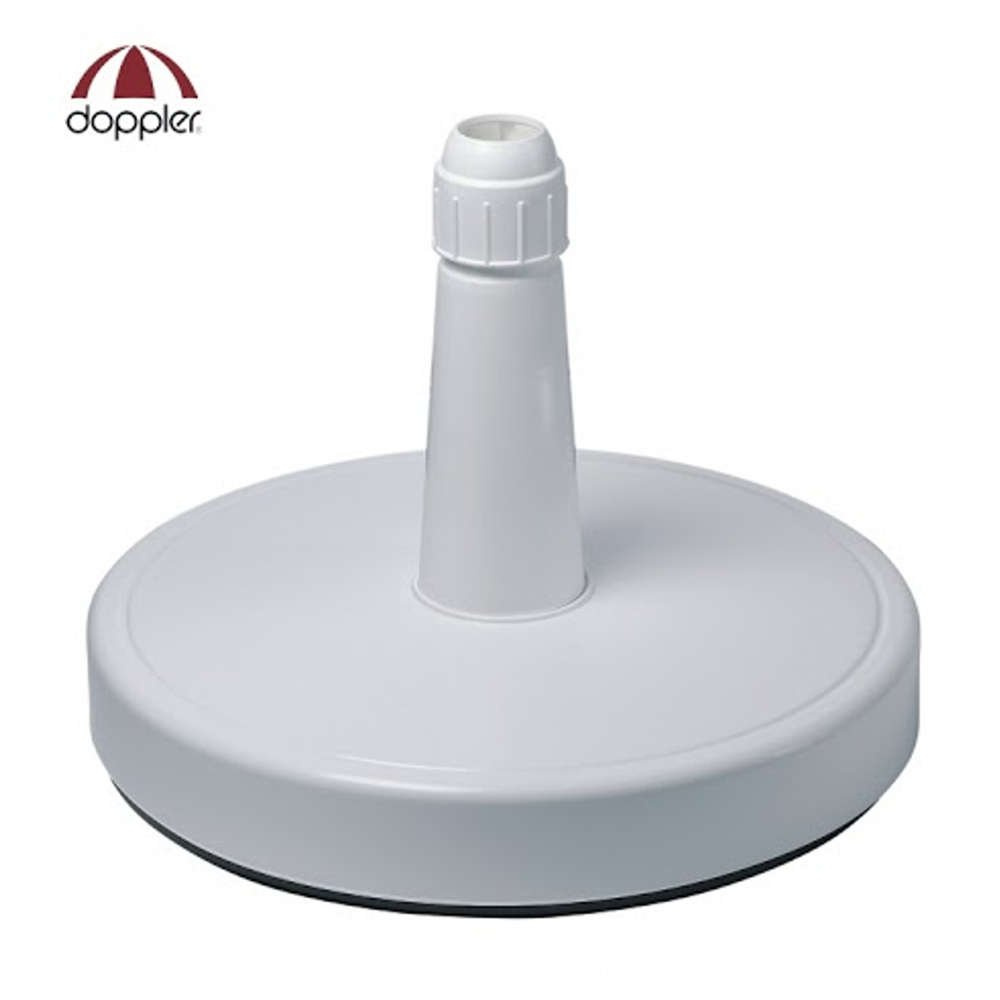 • Biała okrągła podstawa firmy Doppler. Wymaga wypełnienia betonem do masy 70kg. Przeznaczona do parasoli ogrodowych o większych rozmiarach. Wykonana z tworzywa sztucznego. Odpowiednia do masztu o średnicy 28-67mm.
