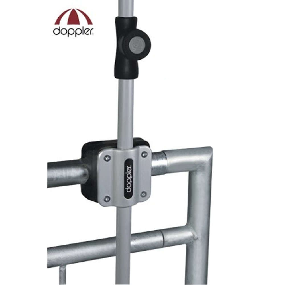 Stalowy uchwyt balkonowy marki Doppler. Firma jest wiodącym producentem mebli i parasoli ogrodowych w Europie. Stale się rozwija i proponuje swoim klientom także praktyczne i nowoczesne akcesoria. Dzięki nim użytkowanie parasoli ogrodowych jest bardziej komfortowe i stają się one wielofunkcyjne. Marka Doppler stara się także dostosować swoją ofertę do różnych potrzeb klientów.