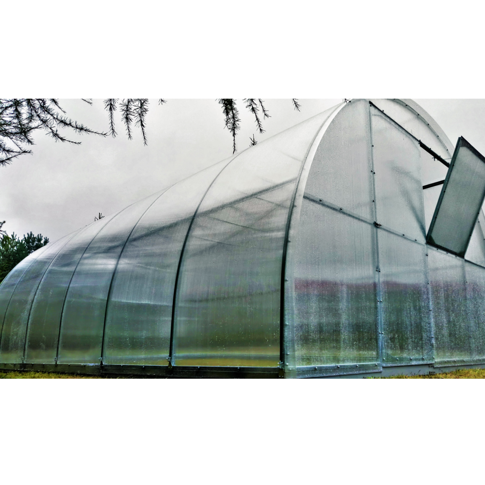 Szklarnia wyposażona została w dwie pary drzwi o szerokości 0,90 m i wysokości 2 m oraz w dwa okienka uchylne o wymiarach 0,90 x 0,95 m, dzięki którym możemy regulować temperaturę wewnątrz i wpuszczać świeże powietrze. Dzięki przęsłom rozstawionym w odległości co 0,97 m konstrukcja szklarni jest niezwykle solidna, posłuży nam z pewnością przez wiele lat.