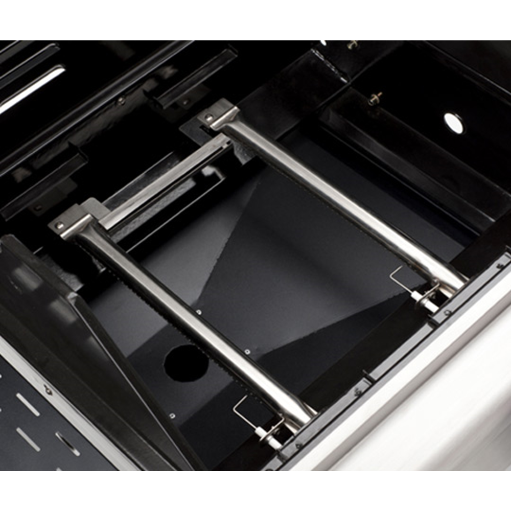 Grill posiada 2 składane półki boczne, dzięki czemu będzie łatwy w przechowywaniu oraz nie będzie zajmował wiele miejsca. Przygotowywanie na nim jedzenia to czysta przyjemność- aby odbywało się to jeszcze łatwiej zastosowano system równomiernej emisji temperatury na całej powierzchni grillowania PTS. Wyposażony został w 2 niezależne tubowe palniki wykonane ze stali szlachetnej (2 x 3,5 kW). Ważną funkcją jest również system gromadzenia wytapiającego się tłuszczu z wyciąganą rynienką ociekową oraz opróżnianym pojemnikiem.