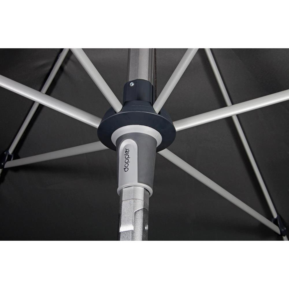 Czasza parasola została umieszczona na aluminiowym, dwuczęściowym kiju. Wyposażony został w funkcję otwierania korbką (Auto Tilt), co jest niezwykle wygodne. Oprócz wygodnego otwierania, mamy możliwość pochylenia czasy, dzięki czemu możemy ustawić pozycję parasola odpowiednio do kąta padania promieni słonecznych. Takie rozwiązania sprawią, że korzystanie z parasola jest bardzo łatwe i jednocześnie wygodne. Przedstawiany model może osiągnąć wysokość 259/229 cm (pod parasolem 205/175 cm).