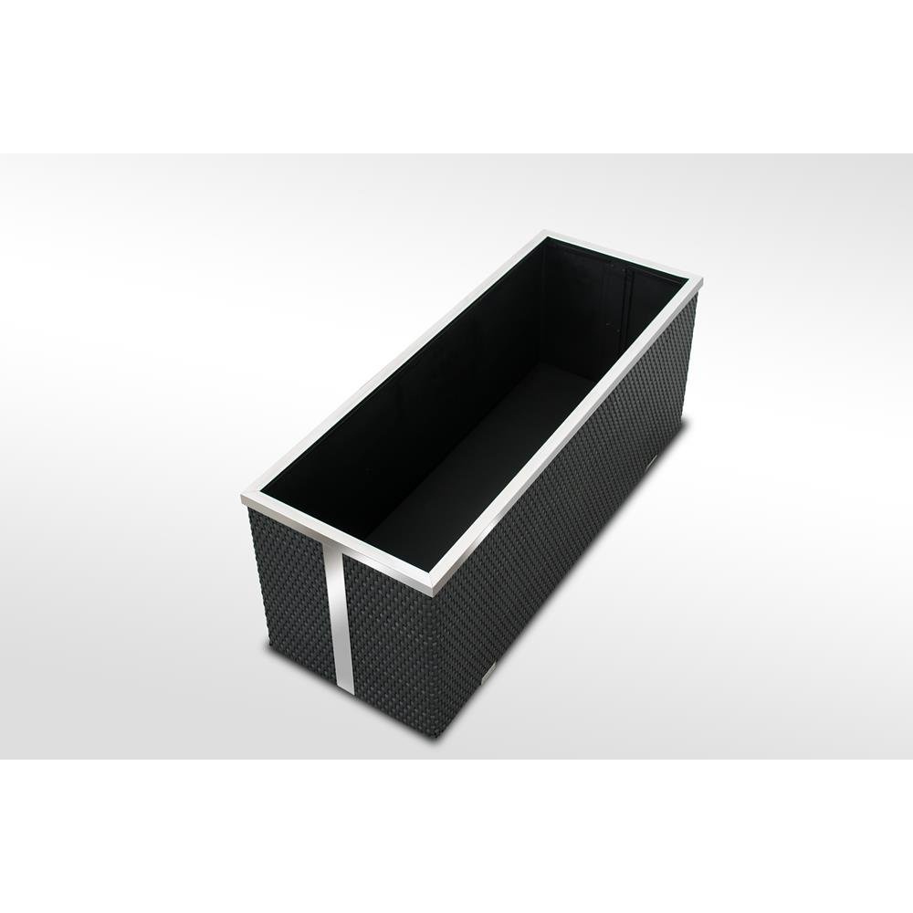 Nowoczesna donica ogrodowa SG03150 z oferty renomowanej marki Rattan Art. Dzięki swojemu minimalistycznemu kształtowi prostokąta idealnie wkomponuje się w każdą przestrzeń w ogrodzie. Wewnętrznie wykonana została z solidnej blachy ocynkowanej, natomiast na zewnątrz wykończona została wyplatanym technorattanem oraz polerowanym aluminium. Całość jest niezwykle stylowa, co sprawi, że posadzone w niej rośliny uzyskają dodatkowego uroku.