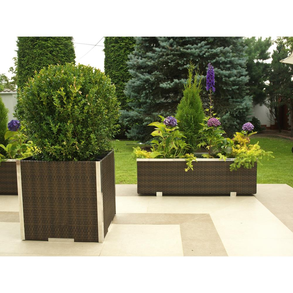 Nowoczesna donica ogrodowa SG03046 z oferty renomowanej marki Rattan Art. Dzięki swojemu minimalistycznemu kształtowi sześcianu idealnie wkomponuje się w każdą przestrzeń w ogrodzie. Wewnętrznie wykonana została z solidnej blachy ocynkowanej, natomiast na zewnątrz wykończona została wyplatanym technorattanem oraz polerowanym aluminium. Całość jest niezwykle stylowa, co sprawi, że posadzone w niej rośliny uzyskają dodatkowego uroku.