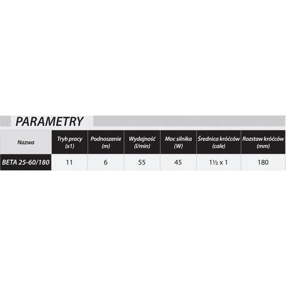 została w silnik o mocy 45W. Rozstaw króćców pompy to 180 mm, a ich średnica -