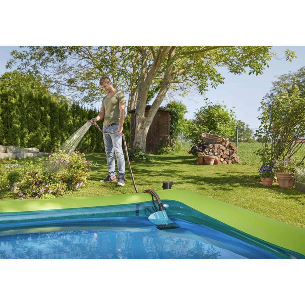 Akumulatorowa pompa 1748-20 marki Gardena przeznaczona do pompowania czystej wody. Dzięki zastosowaniu akumulatora jako źródła zasilania możemy pompować wodę niezależnie od dostępu do gniazda sieciowego. Wspomniany akumulator o napięciu 18V możemy doładować w każdym momencie bez efektu pamięci. Posiada również wyświetlacz LED wskazujący na bieżący stan naładowania.