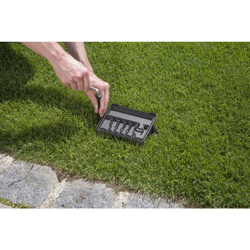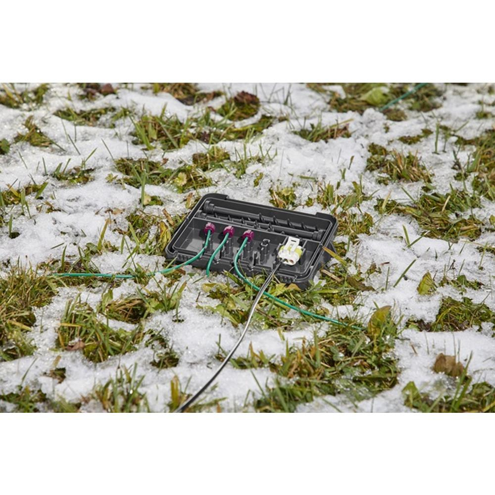 Osłona połączeń przewodów robotów koszących przeznaczona do bezpiecznego przechowywania końcówek przewodów w zimę. Jeśli zimą, robot koszący i stacja ładowania nie są użytkowane, przewody i złączki można bezpiecznie przechowywać w solidnym pudełku, wykonanym z tworzywa sztucznego, odpornym na działanie czynników atmosferycznych.