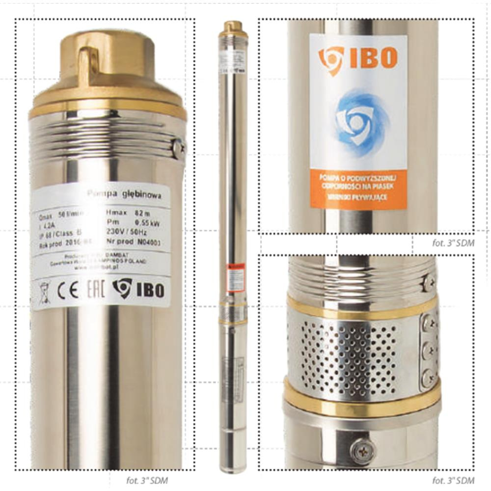 wielostopniowa pompa głębinowa z serii SDM marki IBO. Pompa ma średnicę 74 mm i