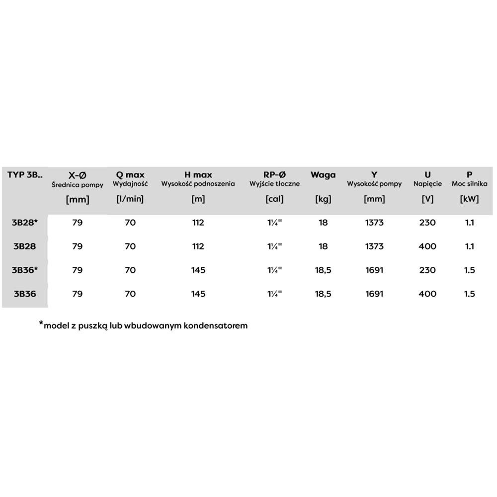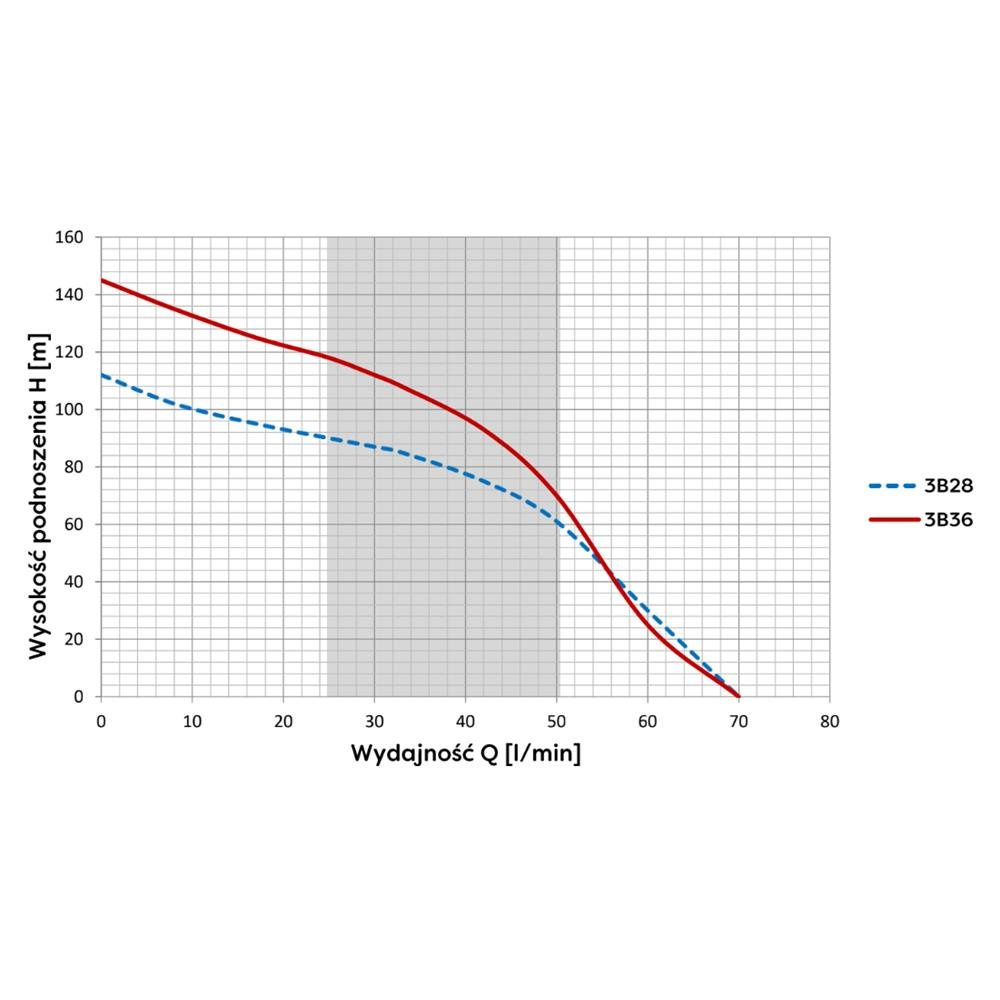 Pompa głębinowa 3B28 działa na silniku elektrycznym o mocy 1100 W i napięciu 400 V. Silnik cechuje stosunkowo cicha praca i niski pobór prądu. Maksymalna wydajność pompy to 70 l/minutę. Maksymalne podnoszenie pompy to 112 m. Do pompy pasują przyłącza o średnicy 1 1/4 cala. Urządzenie posiada dołączony kabel zasilający o długości 20 m.