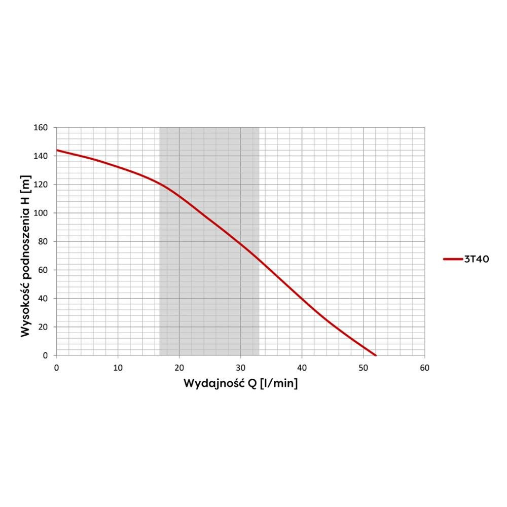 Pompa głębinowa 3T40 działa na silniku elektrycznym o mocy 1100 W i napięciu 230 V. Silnik cechuje stosunkowo cicha praca i niski pobór prądu. Maksymalna wydajność pompy to 52 l/minutę. Maksymalne podnoszenie pompy to 144 m. Do pompy pasują przyłącza o średnicy 1 cala. Urządzenie posiada dołączony kabel zasilający o długości 20 m.