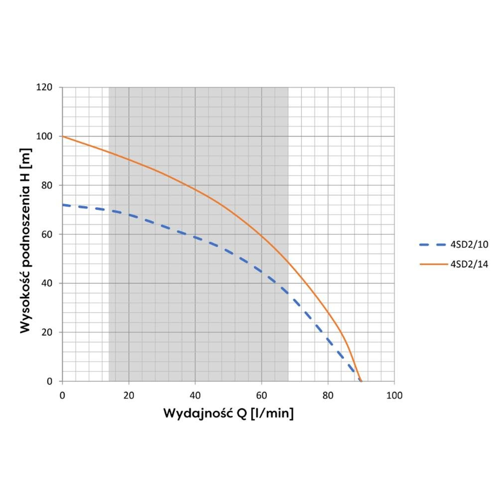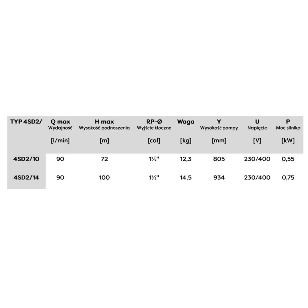 Pompa głębinowa 4SD 2-10 działa na silniku elektrycznym o mocy 0,55 kW i napięciu 400 V. Silnik cechuje stosunkowo cicha praca i niski pobór prądu. Maksymalna wydajność pompy to 90 l/minutę. Maksymalne podnoszenie pompy to 72 m. Do pompy pasują przyłącza o średnicy 1 1/2 cala. Urządzenie posiada dołączony kabel zasilający o długości 20 m.
