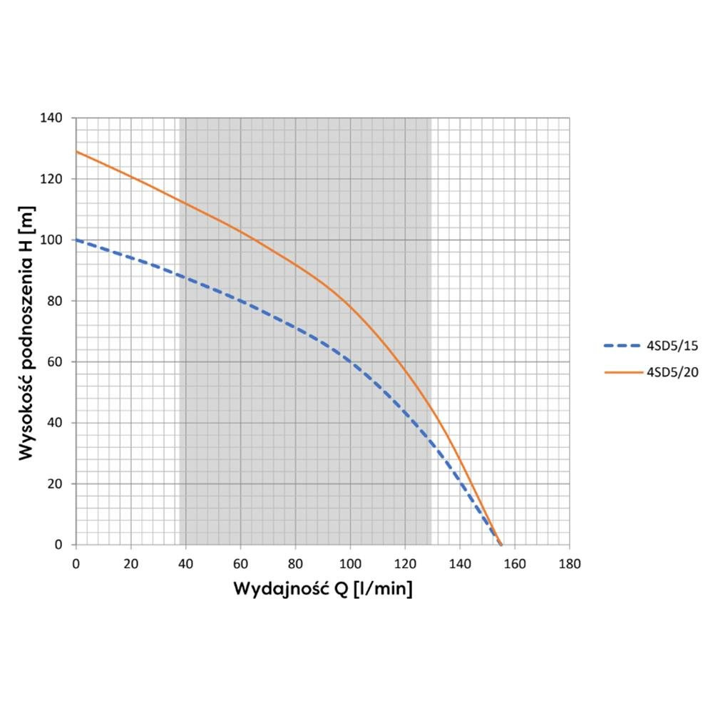 Pompa głębinowa 4SD 5-20 działa na silniku elektrycznym o mocy 2,2 kW i napięciu 230 V. Silnik cechuje stosunkowo cicha praca i niski pobór prądu. Maksymalna wydajność pompy to 155 l/minutę. Maksymalne podnoszenie pompy to 129 m. Do pompy pasują przyłącza o średnicy 2 cali. Urządzenie posiada dołączony kabel zasilający o długości 20 m.