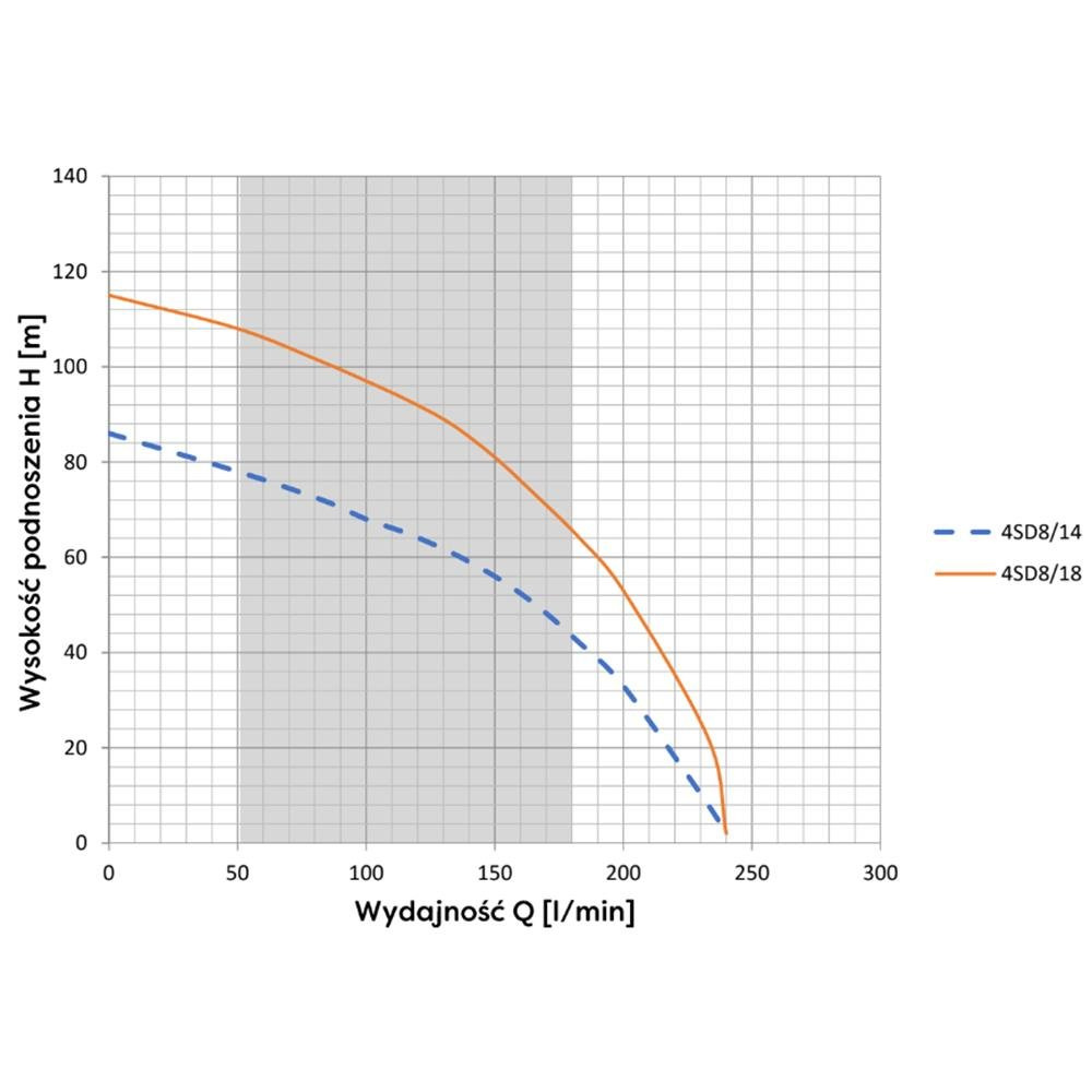 Pompa głębinowa 4SD 8-14 działa na silniku elektrycznym o mocy 2,2 kW i napięciu 400 V. Silnik cechuje stosunkowo cicha praca i niski pobór prądu. Maksymalna wydajność pompy to 240 l/minutę. Maksymalne podnoszenie pompy to 86 m. Do pompy pasują przyłącza o średnicy 2 cali. Urządzenie posiada dołączony kabel zasilający o długości 20 m.