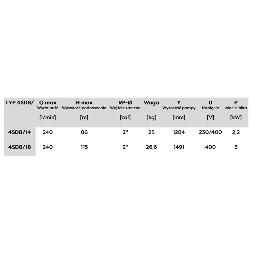 Pompa głębinowa 4SD 8-18 działa na silniku elektrycznym o mocy 3 kW i napięciu 230 V. Silnik cechuje stosunkowo cicha praca i niski pobór prądu. Maksymalna wydajność pompy to 240 l/minutę. Maksymalne podnoszenie pompy to 115 m. Do pompy pasują przyłącza o średnicy 2 cali. Urządzenie posiada dołączony kabel zasilający o długości 20 m.