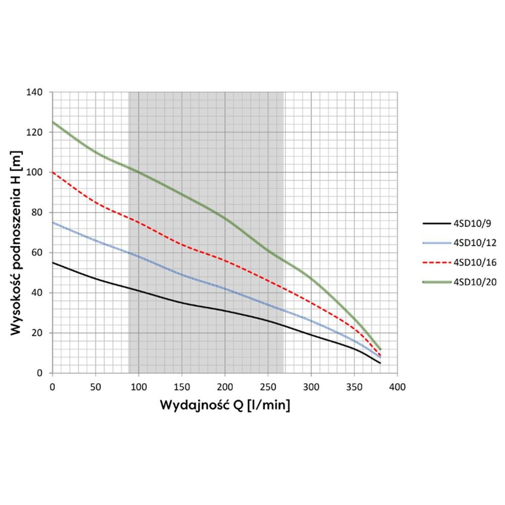 Pompa głębinowa 4SD 10-16 działa na silniku elektrycznym o mocy 4 kW i napięciu 400 V. Silnik cechuje stosunkowo cicha praca i niski pobór prądu. Maksymalna wydajność pompy to 380 l/minutę. Maksymalne podnoszenie pompy to 100 m. Do pompy pasują przyłącza o średnicy 2 cali. Urządzenie posiada dołączony kabel zasilający o długości 20 m.
