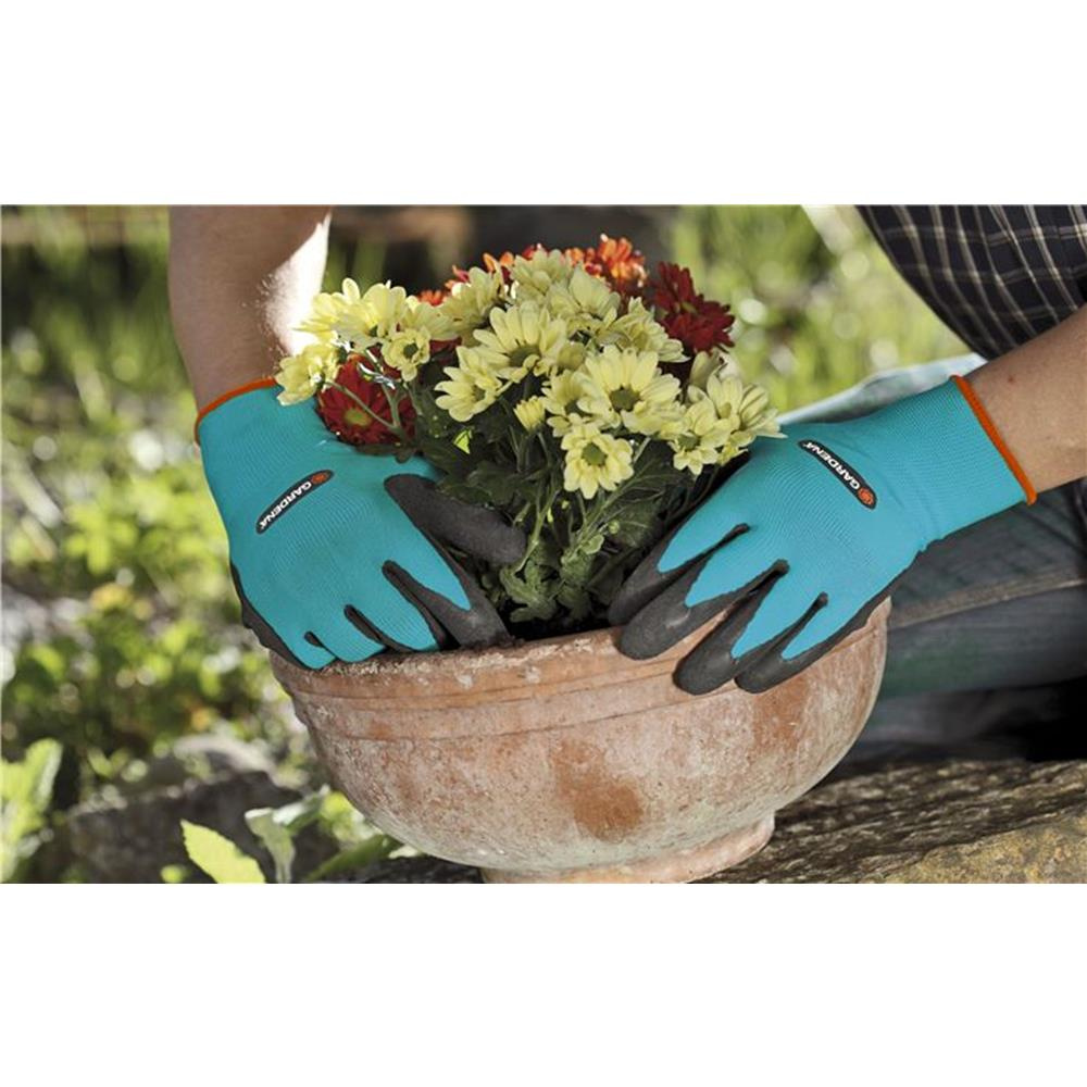 w rękawicach do prac pielęgnacyjnych, idealnych zwłaszcza podczas pracy w