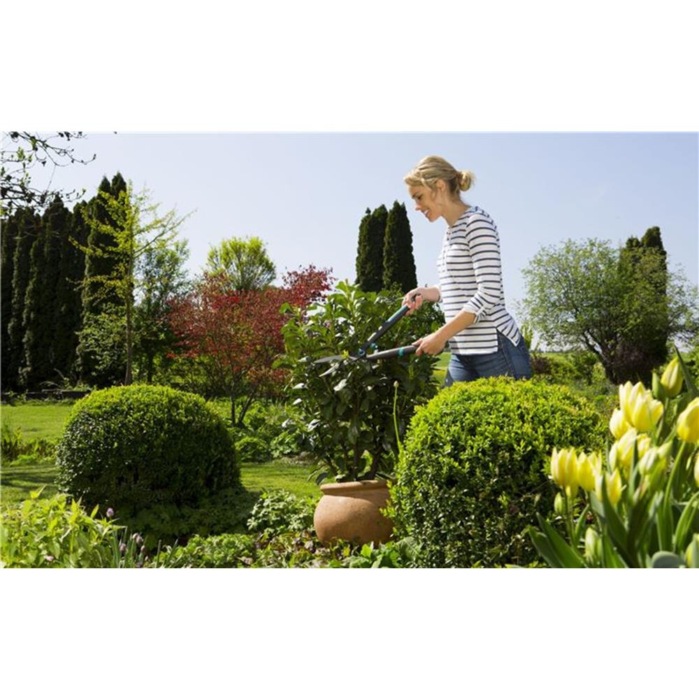 Nożyce do żywopłotu EasyCut marki Gardena są wszechstronne, odpowiednie do każdej pracy. Wyposażone zostały w wysokojakościowe uchwyty ErgoTec, które pewnie czuć w dłoniach, są wyważone i ergonomiczne. Wykonane zostały z bardzo wytrzymałych tworzyw sztucznych, które dodatkowo wzmocnione zostały włóknem. Cięcie jest amortyzowane przez miękki odbojnik, chroni to przed zbyt gwałtownymi cięciami.