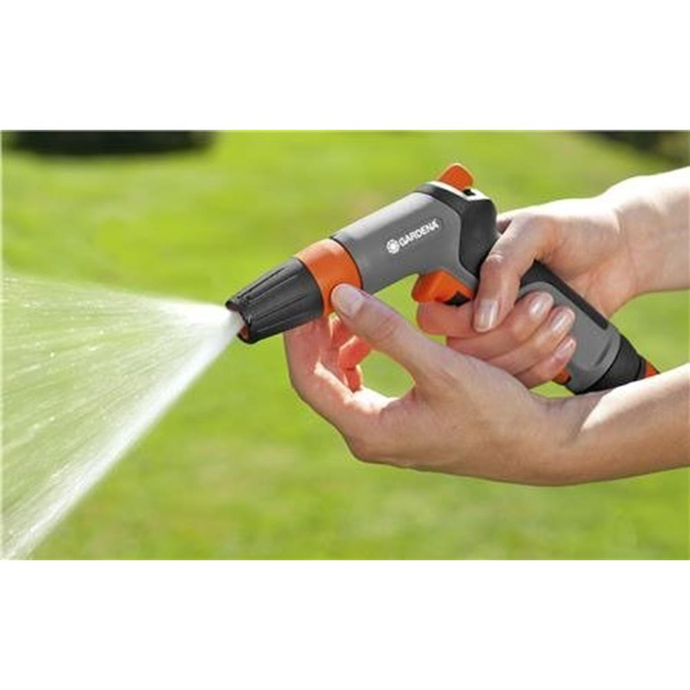 Pistolet zraszający 18301-20 z serii Classic marki Gardena przeznaczony do podlewania lub mycia. Łatwa, bezstopniowa regulacja wody pozwala na kontrolę jedną ręką. Dzięki temu masz do wyboru silny strumień punktowy do mycia lub lekką mgiełkę, która idealna jest do nawadniania roślin.